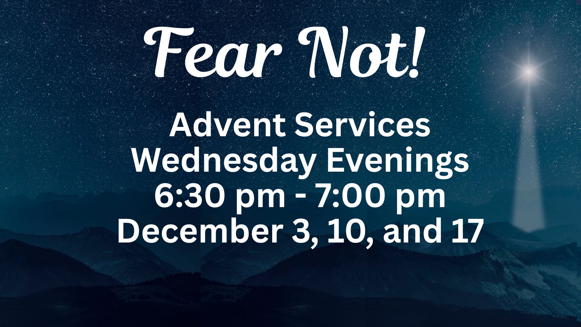 Join us for Advent Service. December 3, 10 and 17 from 6:30pm to 7:00pm in the Sanctuary.
