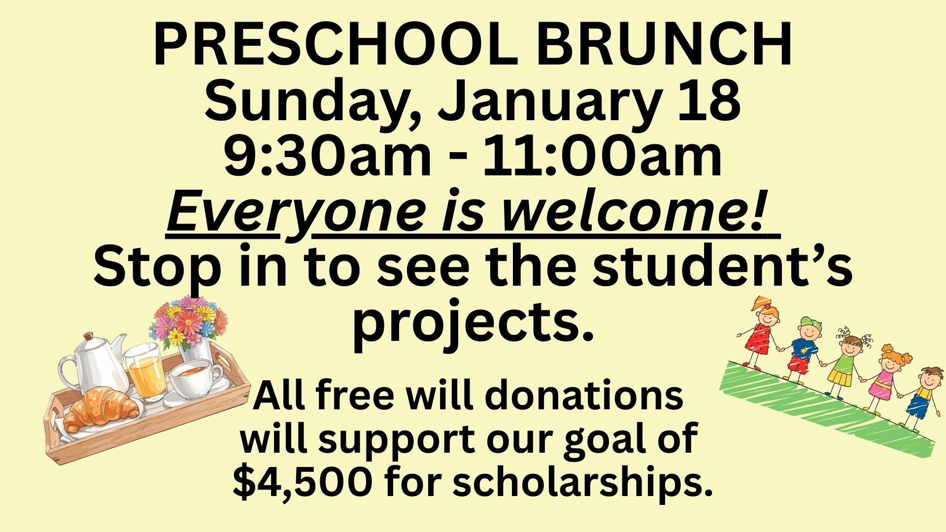 Please join us for the Preschool Brunch! All free will donations will support our goal of $4,500 for scholarships.